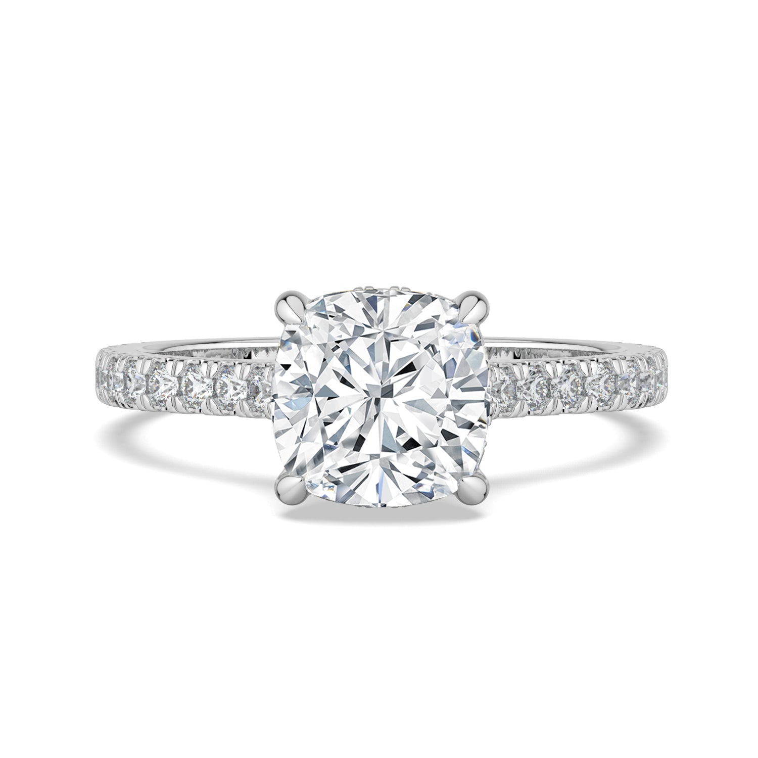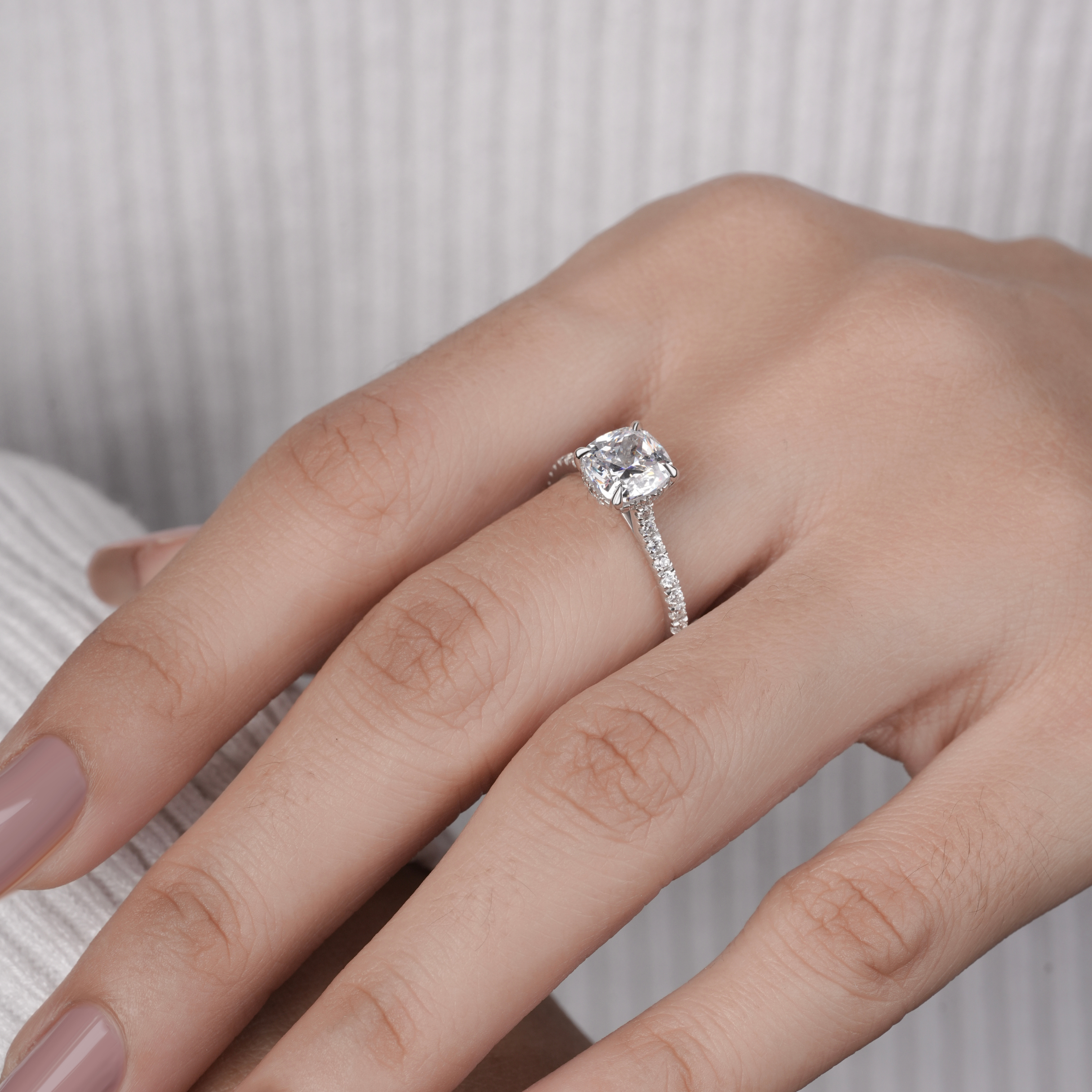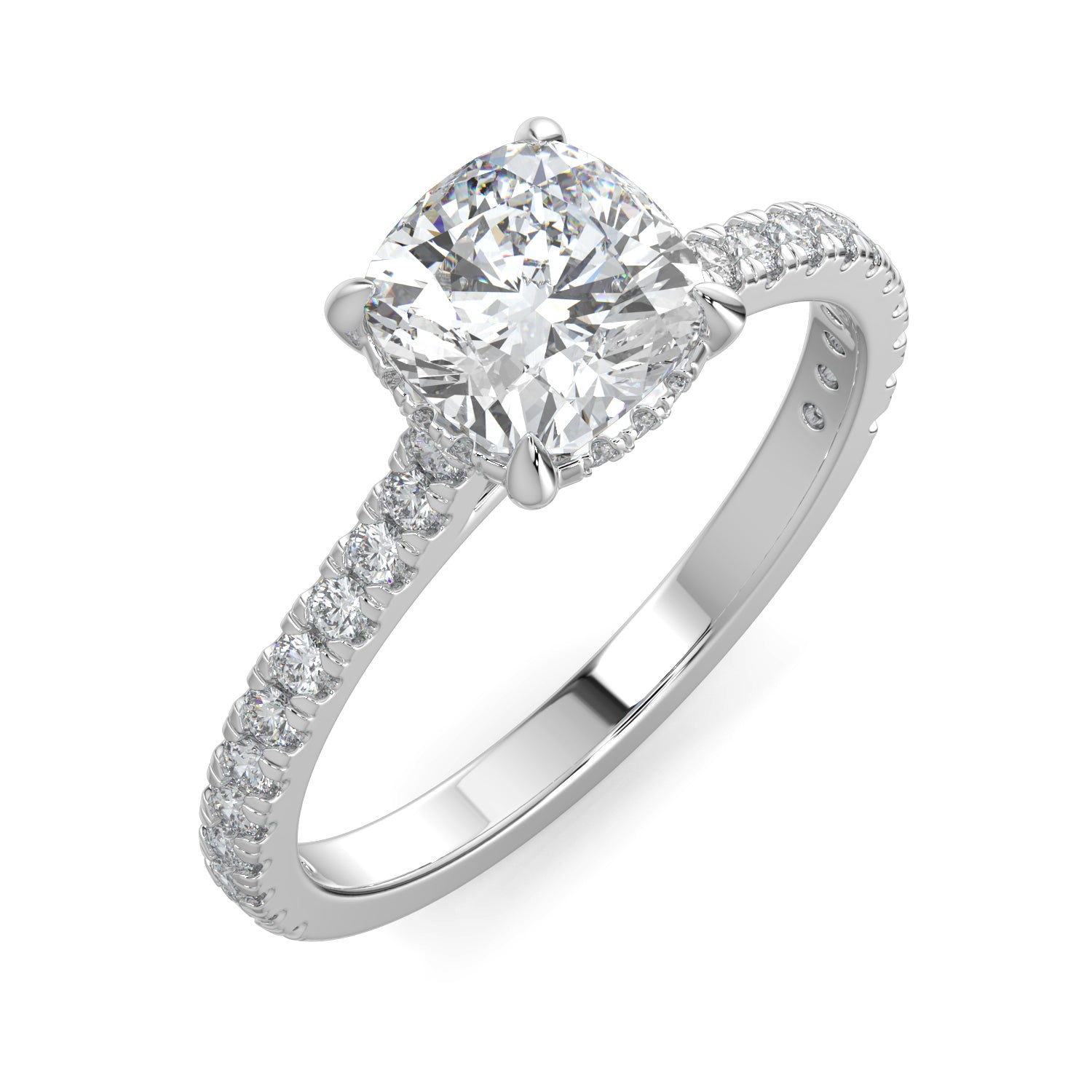 Introducing our Hidden Halo cushion-Cut Engagement Ring. This stunning piece features a unique hidden halo design that adds extra sparkle and glamour to the classic cushion-cut diamond. Perfect for expressing your love and commitment to your special someone.