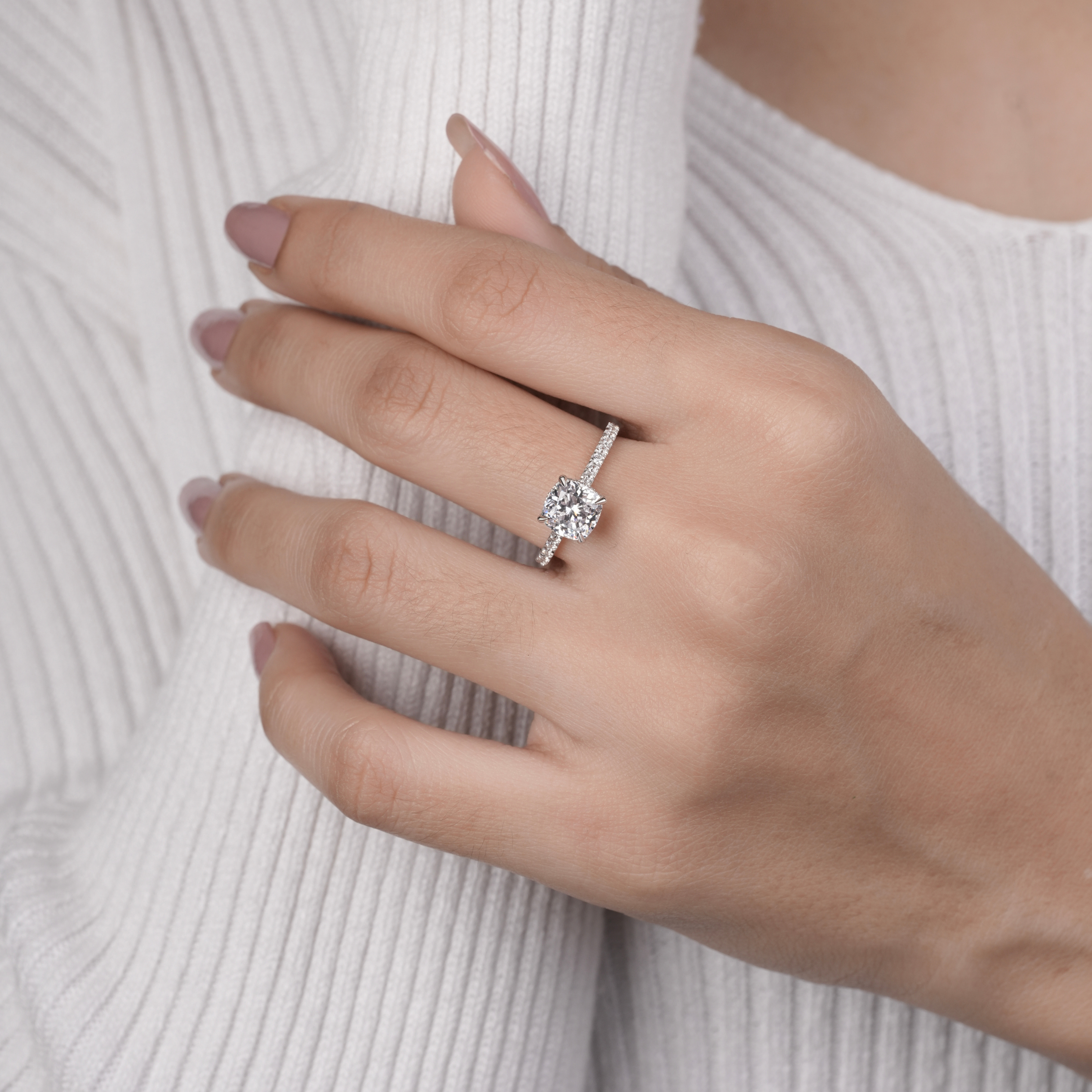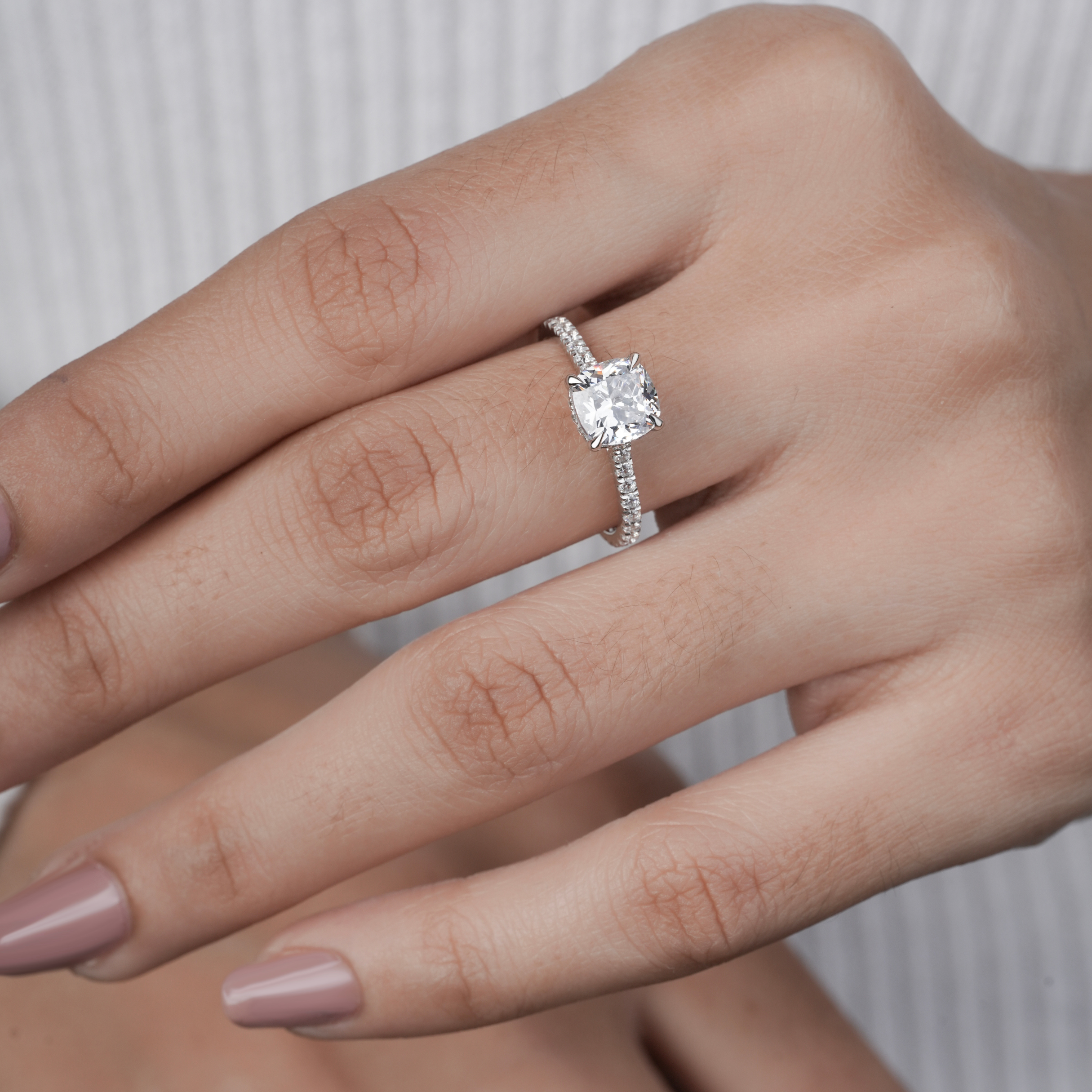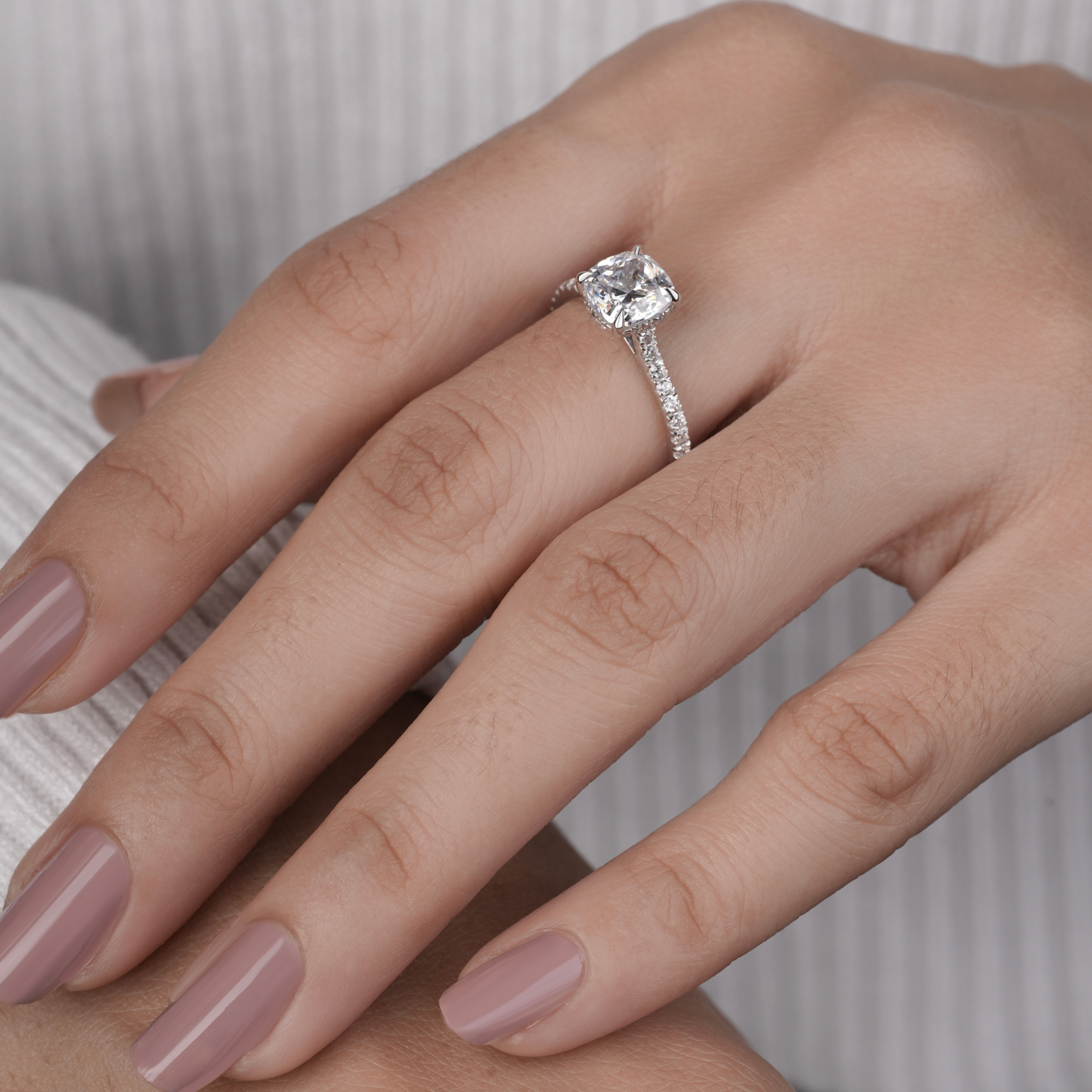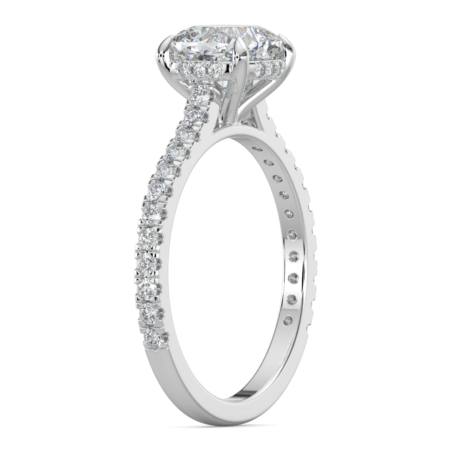 Introducing our Hidden Halo cushion-Cut Engagement Ring. This stunning piece features a unique hidden halo design that adds extra sparkle and glamour to the classic cushion-cut diamond. Perfect for expressing your love and commitment to your special someone.