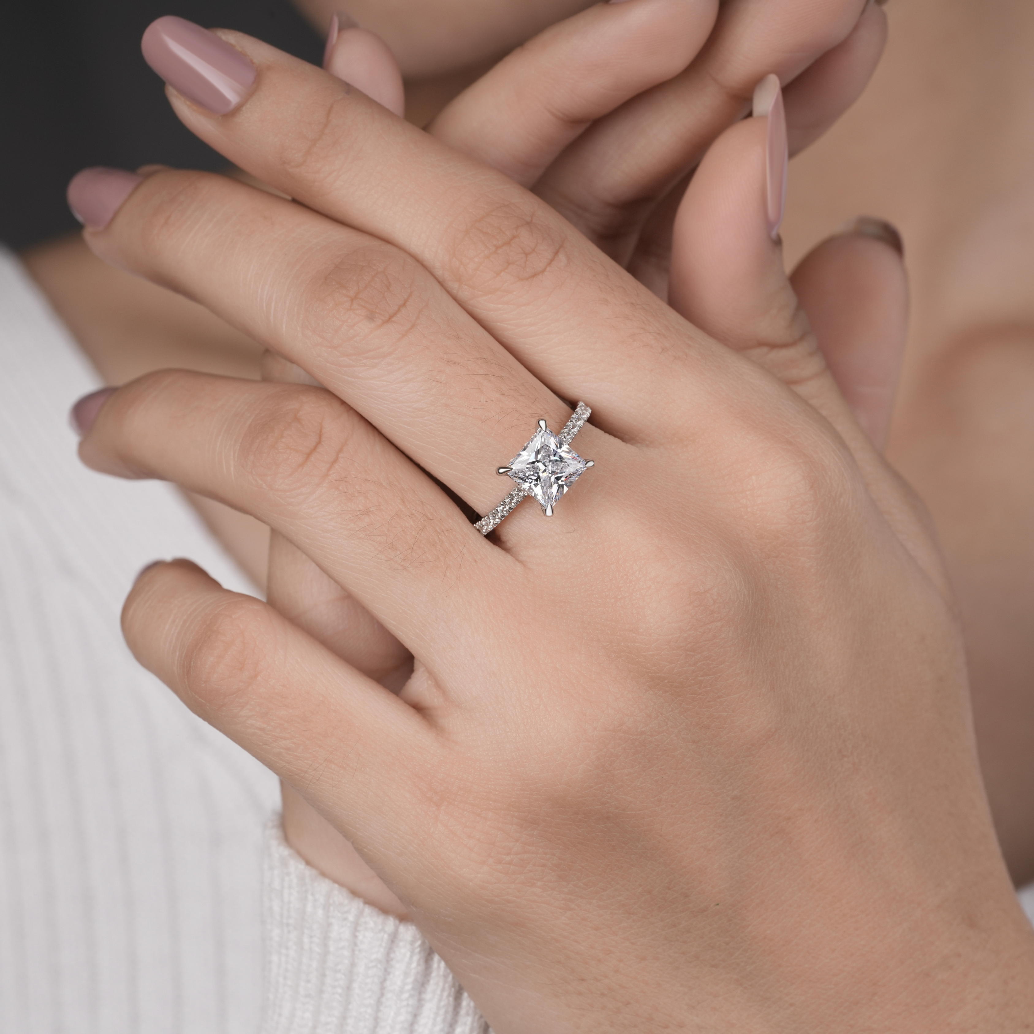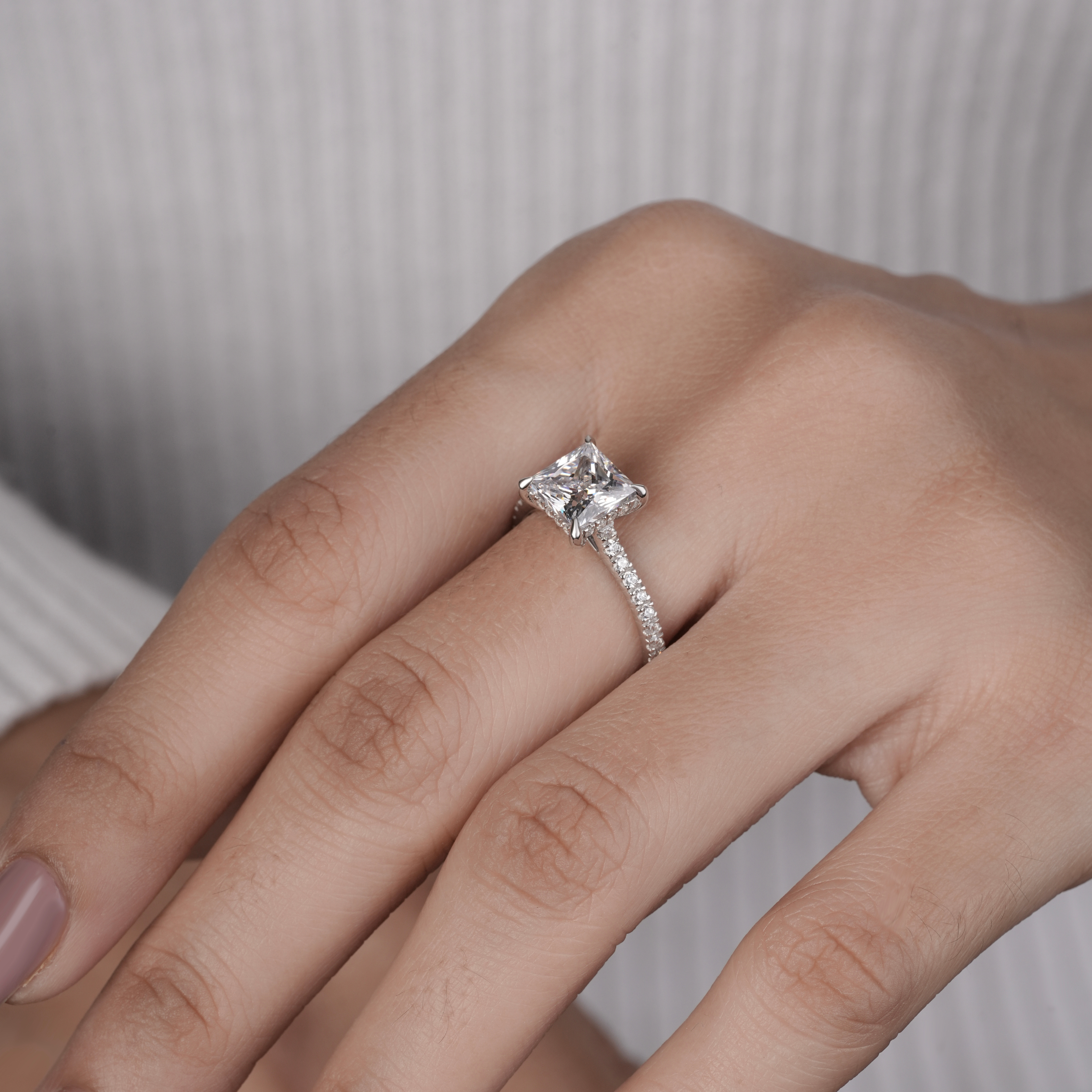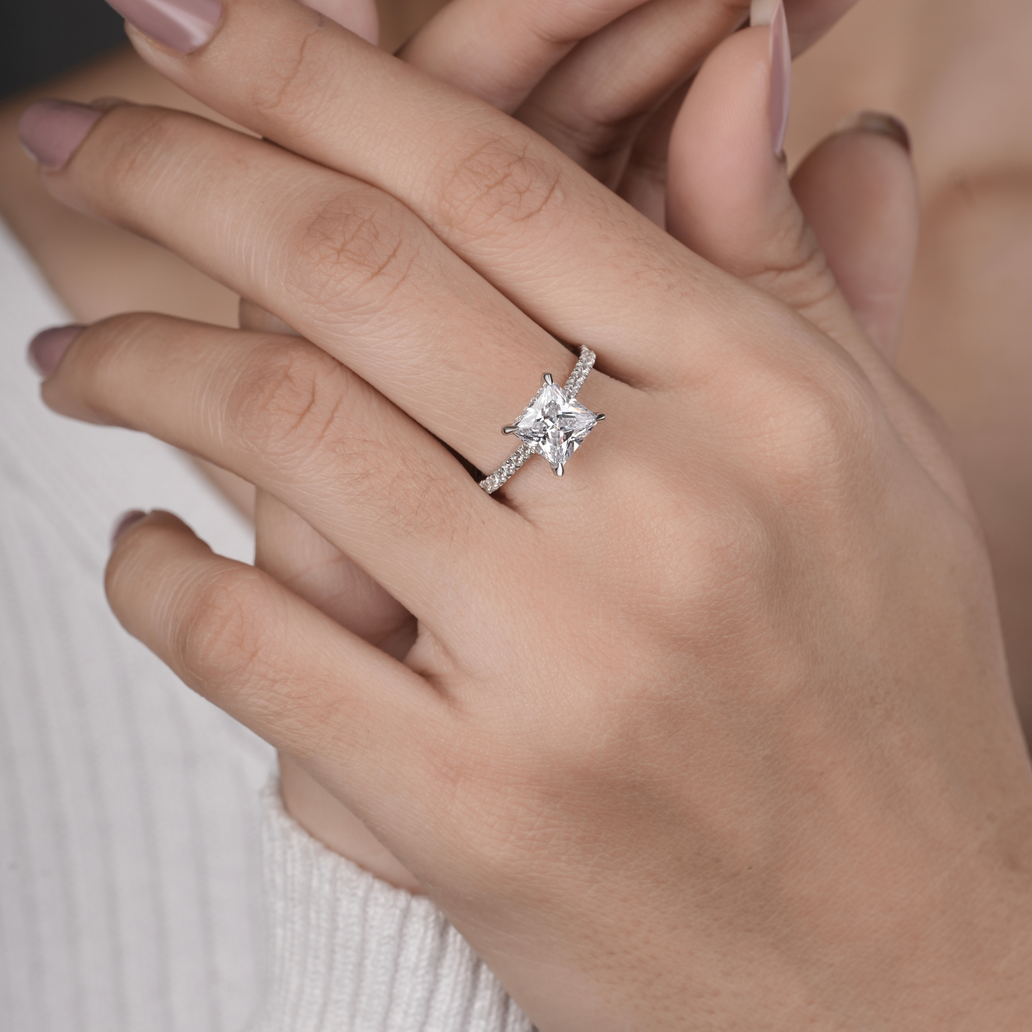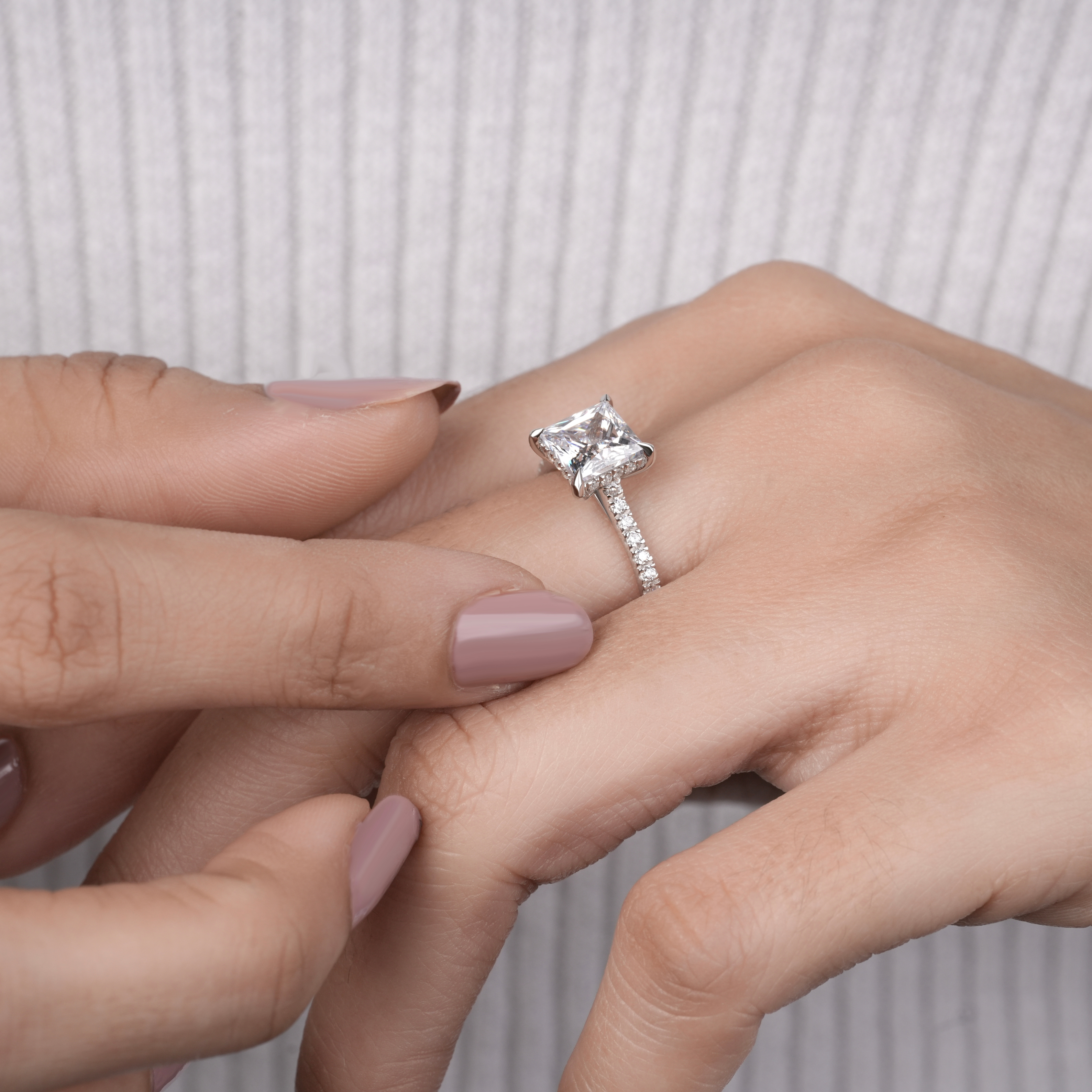 The Hidden Halo princess-Cut Engagement Ring is a beautiful and elegant choice for any proposal. With its unique hidden halo design, this ring adds a touch of sophistication and charm to any finger. Made with high-quality materials, it is a lasting symbol of your love and commitment.