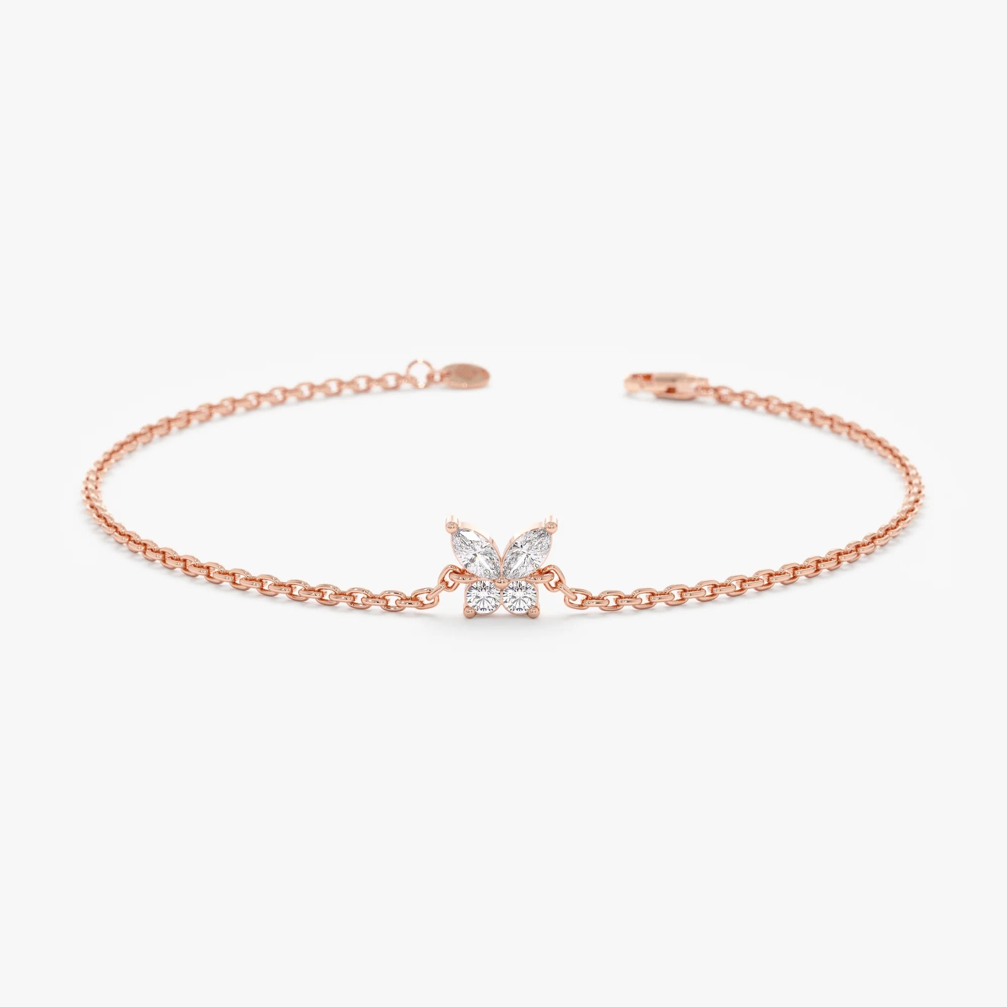 Delicate butterfly motifs adorned with sparkling diamonds create an enchanting wrist accessory that captures nature's grace. This sophisticated bracelet seamlessly transitions from day to evening wear, offering timeless elegance with its refined design. The carefully placed diamonds catch light beautifully, adding a touch of luxury to any ensemble. Perfect for those who appreciate subtle symbolism and exquisite craftsmanship, this piece celebrates transformation and beauty in understated style.